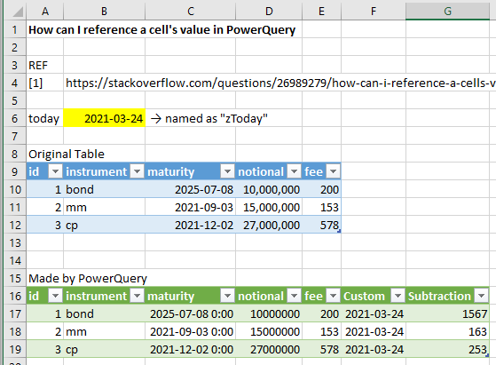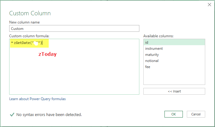 = (zDate) => Excel.CurrentWorkbook(){[Name=zDate]}[Content]{0}[Column1]④ Return to "Table1" and add a colum as below