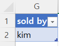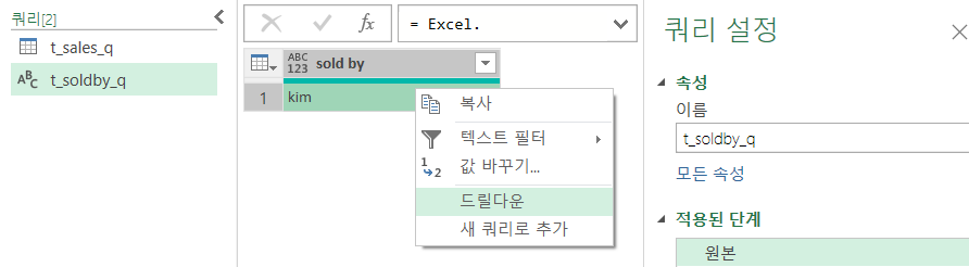 | let 원본 = Excel.CurrentWorkbook(){[Name="t_soldby"]}[Content], #"sold by" = 원본{0}[sold by] in #"sold by" |
