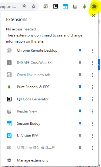 Chrome 주소창 옆에 직소 jigsaw 처럼 생긴 아이콘을 누르면 보인다.
