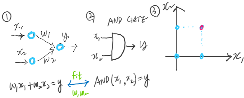 w1과 w2를 잘 조정해서, 그림 ③에 파란점과 빨간점을 구분짓는 직선을 그리는 것