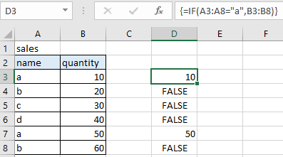 d3:d8에 있는 수식; {=IF(A3:A8="a",B3:B8)}